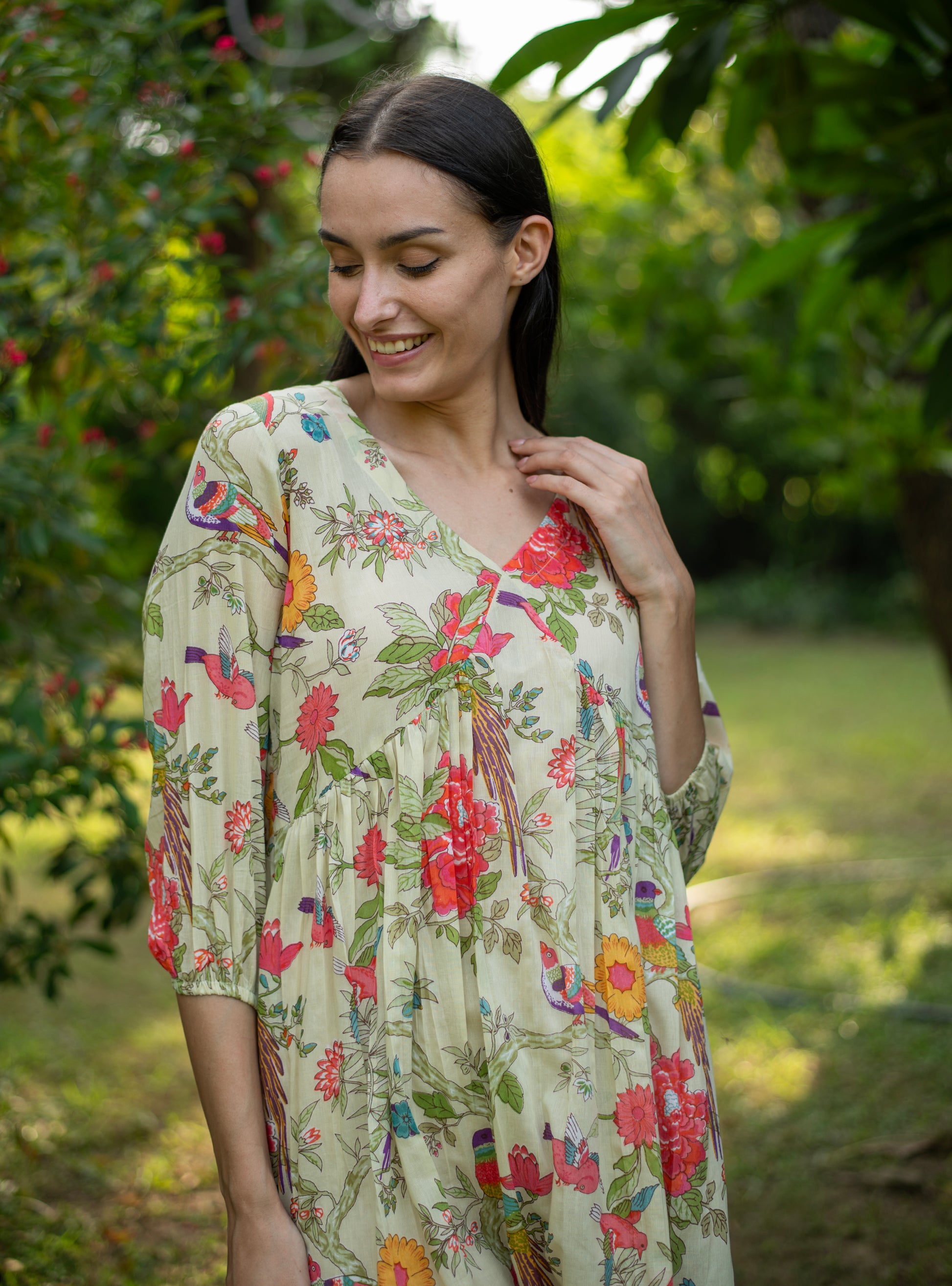 Inspired by the serene beaches of Kovalam, this lightweight voile dress features an enchanting bird motif in fresh lime tones. The breathable fabric drapes elegantly, making it ideal for warm climates and resort wear. The expert craftsmanship ensures comfort without compromising on style, while the vibrant print adds a touch of nature-inspired sophistication to your wardrobe. Perfect for leisurely days by the water or casual evening gatherings.